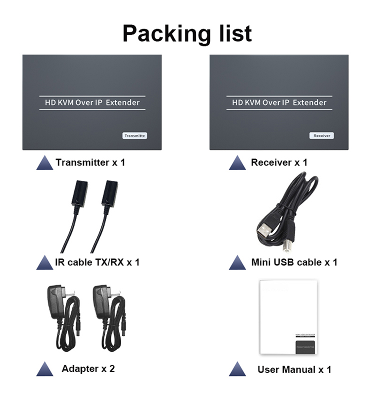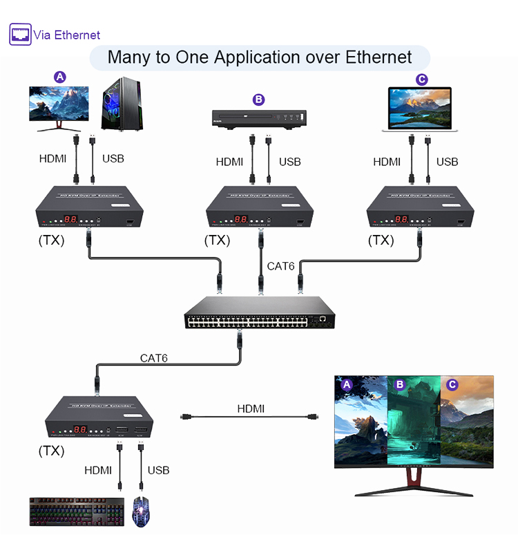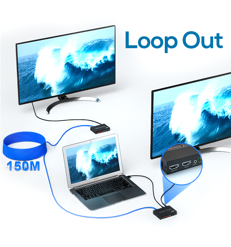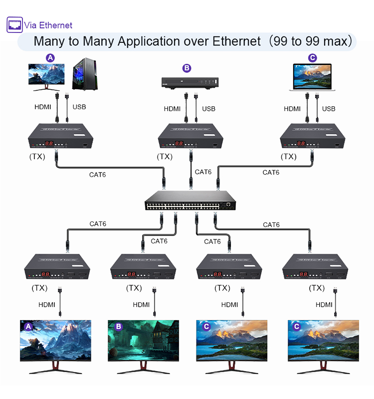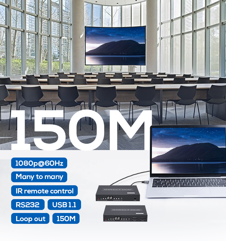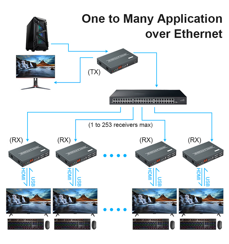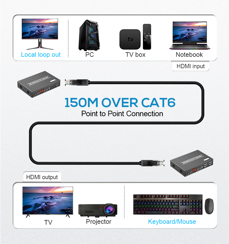 This product can achieve many-to-many through the switch, supports up to 99 to 99, the highest resolution: 1080P@60Hz, and can be extended by 150M through Cat5e network cable.